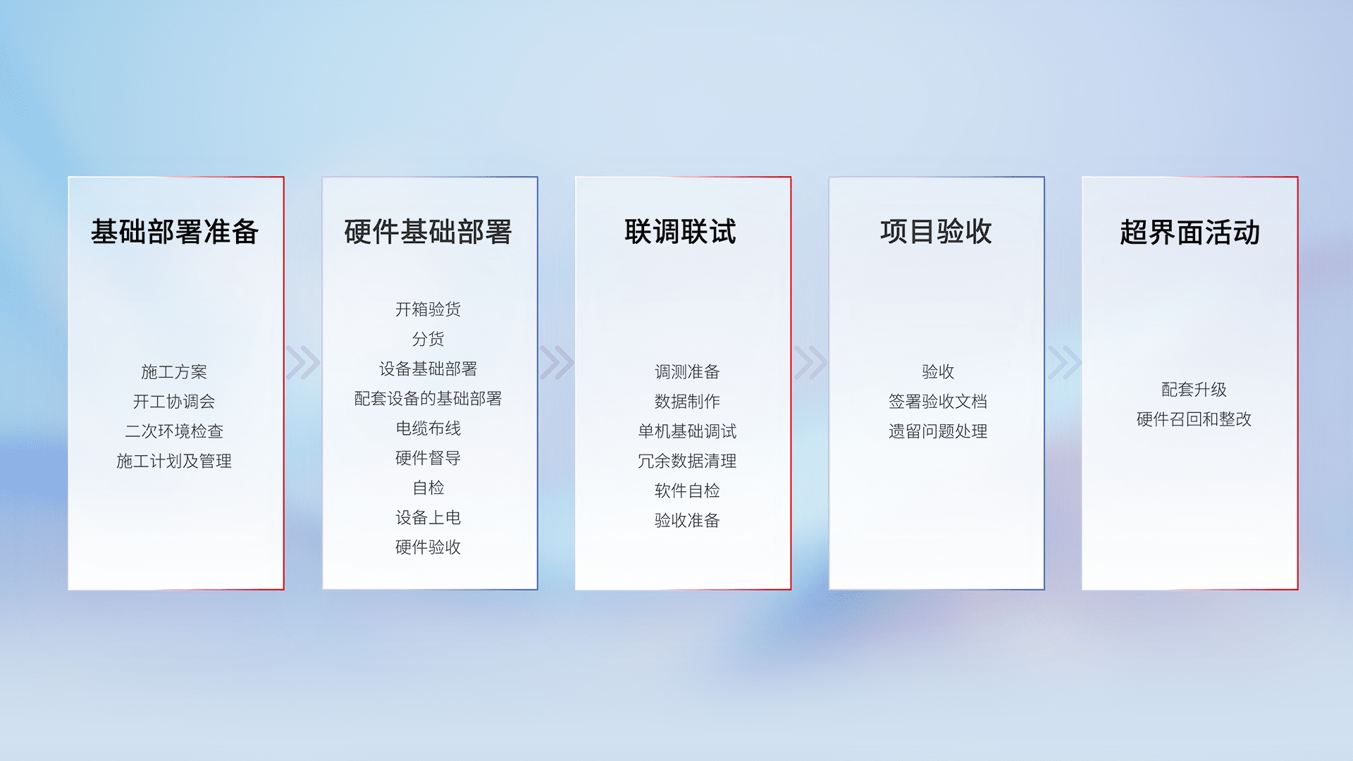 从基础部署准备、、、硬件基础部署、、联调联试、、项目验收、、越界面活动的全过程可追溯,,,,保证施工质量和进度。。。